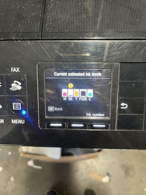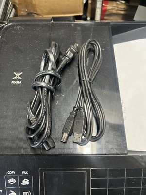USB printer cable and power cord. Black cartridge is low.